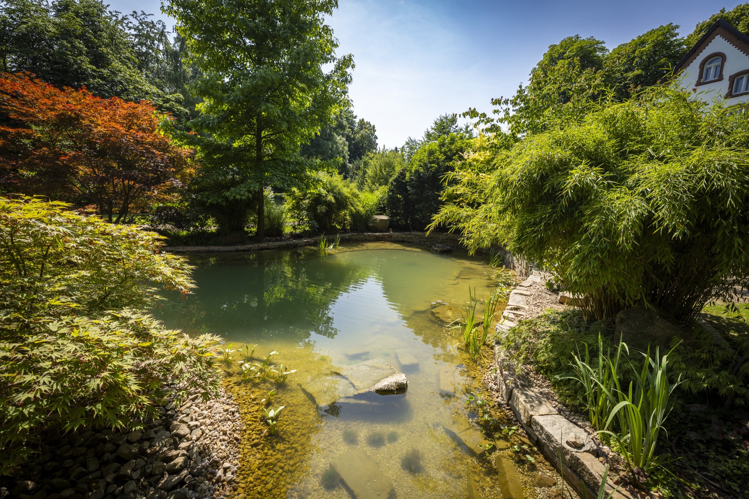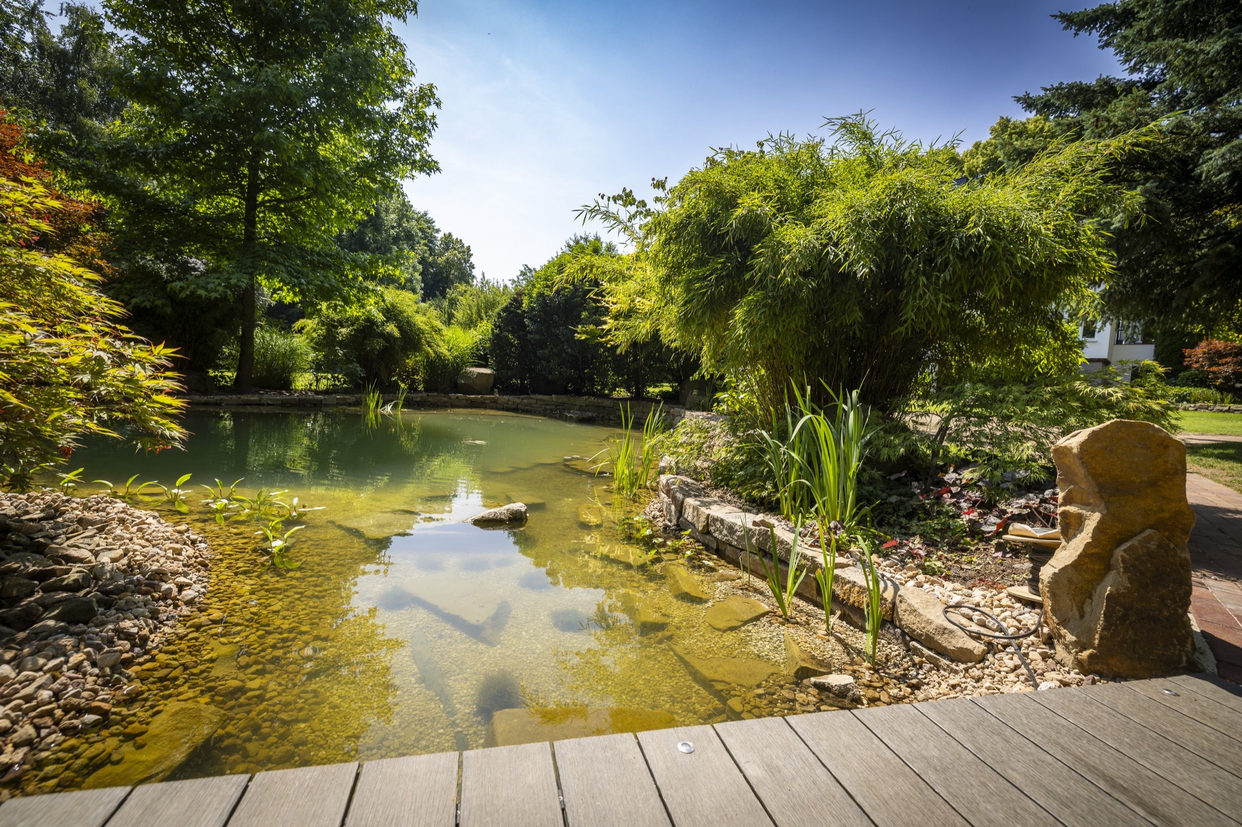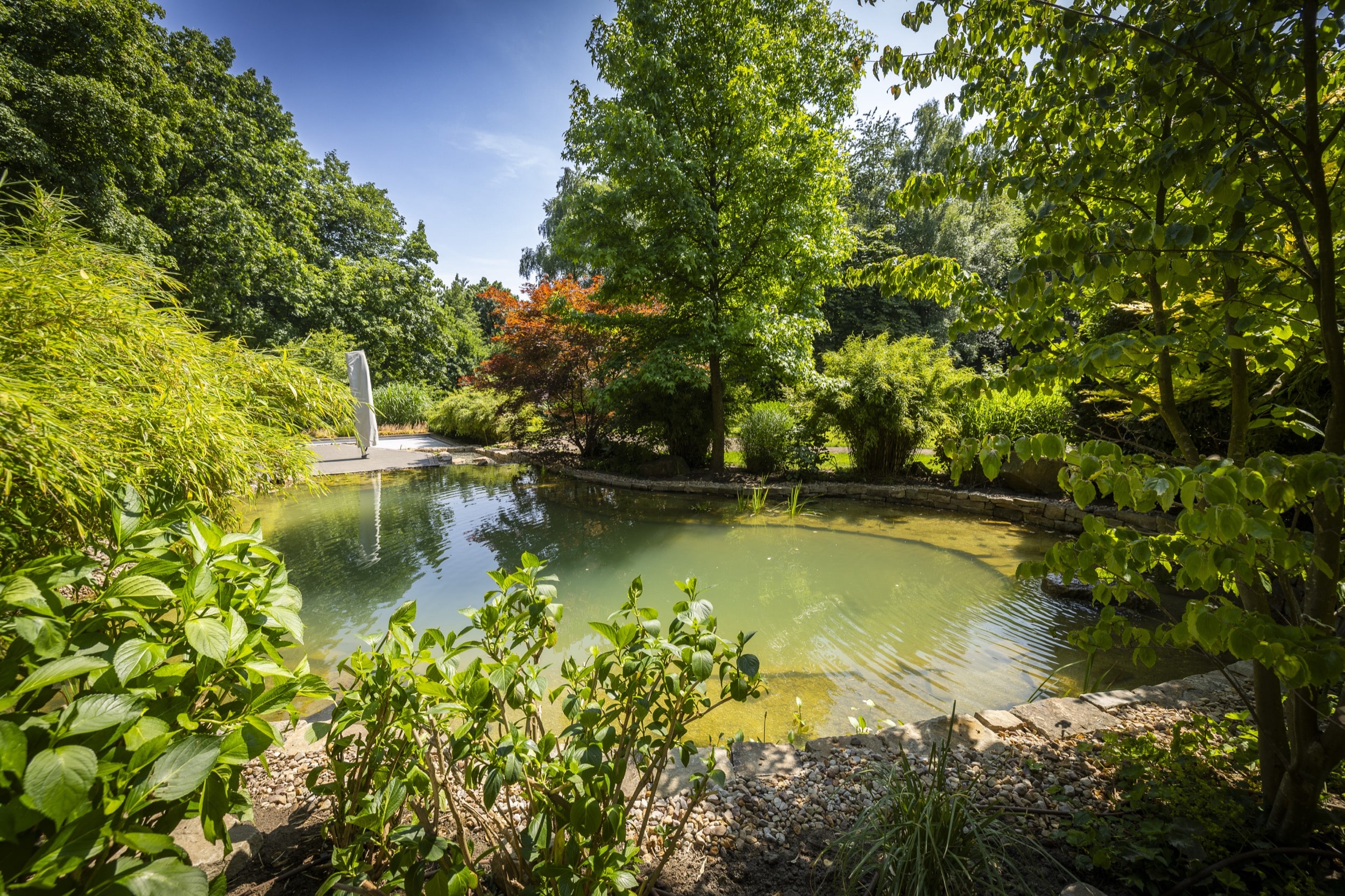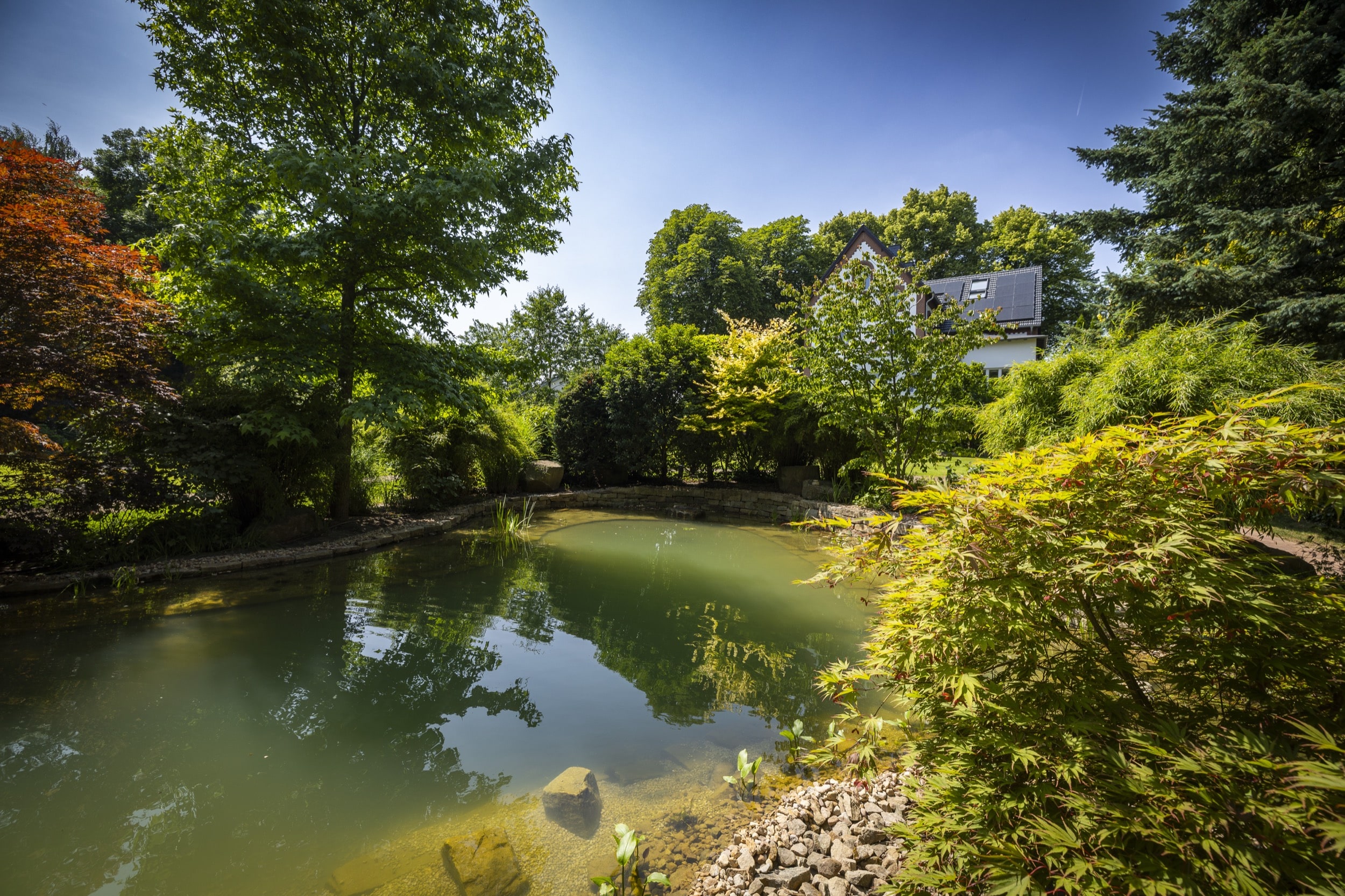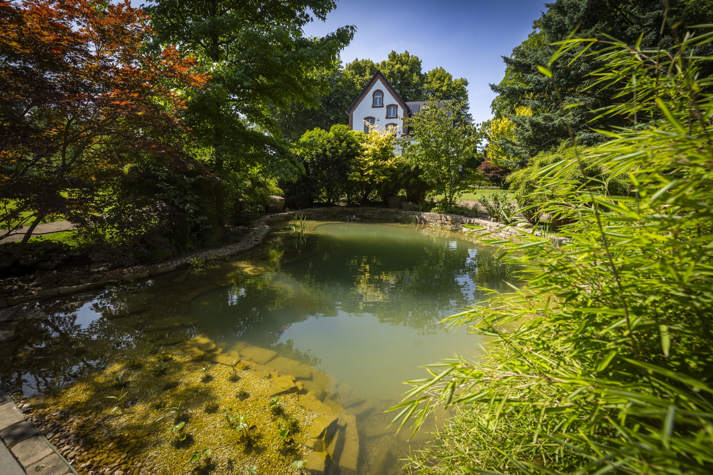 In einem Dortmunder Privatgarten wurde ein bestehender Teich vollständig umgestaltet und technisch wie optisch modernisiert. Da der Bagger den Einsatzort nicht erreichen konnte, wurden drei bis zu 600 Kilogramm schwere Ruhrsandstein-Findlinge per Kran millimetergenau positioniert – sie bilden nun das natürliche Herzstück der neuen Anlage. Nach dem Entfernen der alten Folie und Bepflanzung erfolgte die neue Abdichtung durch einen Folienbauer, während das Team um Kevin die Gestaltung und Neubepflanzung übernahm. Ergänzt wurde das Projekt durch den Bau von Natursteinmauern, die Installation moderner Teichtechnik und eine abgestimmte Gartenbeleuchtung. Das Ergebnis ist ein harmonisch gestaltetes Gartenparadies, das mit glitzerndem Wasser, vitalen Pflanzen und durchdachter Gestaltung überzeugt.